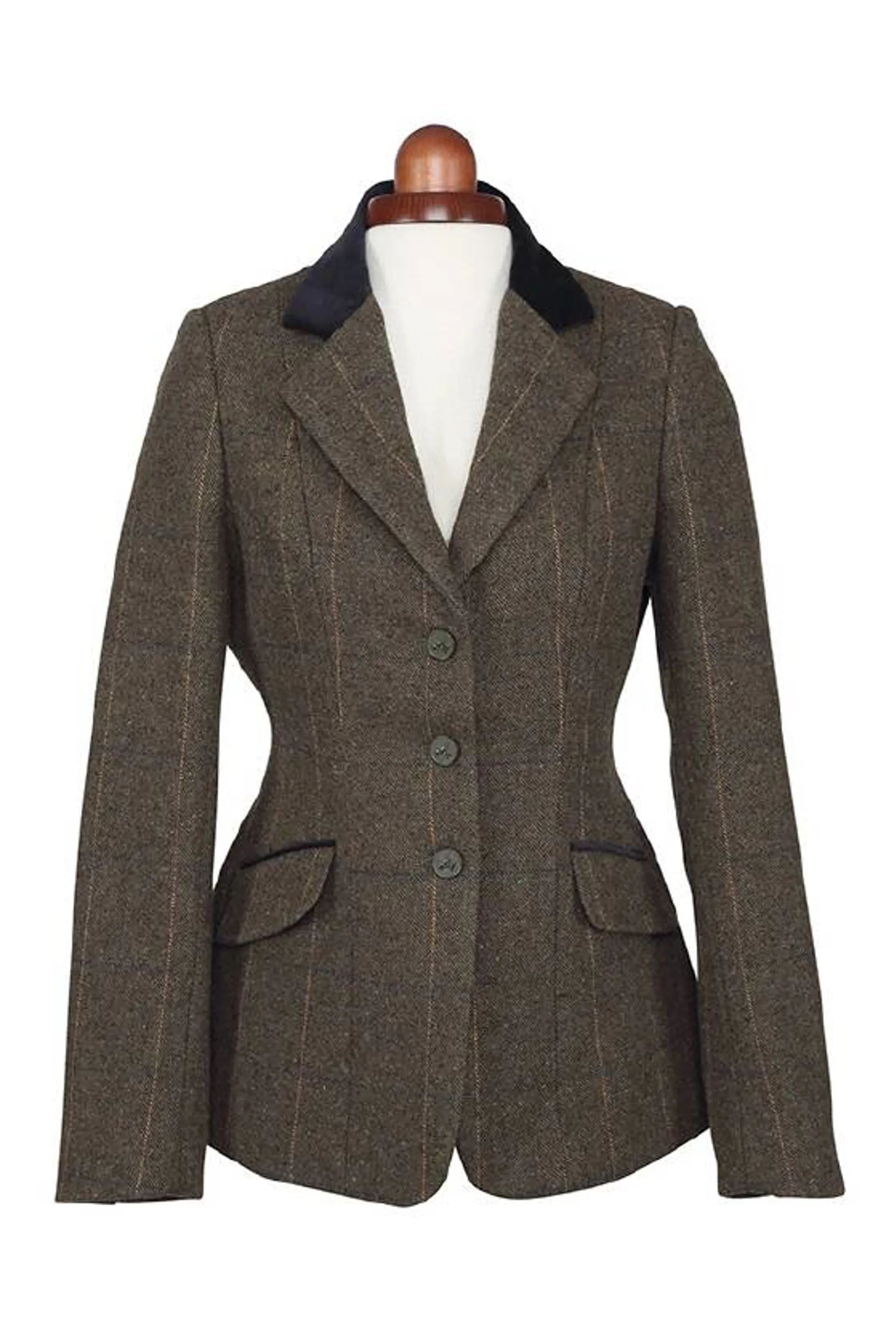 Tailored to flatter, velvet trim collar and pockets, double rear vents, horse button details, two flap pockets, pheasant print lining. Green check, copper check, navy/maroon check, red/yellow/blue check, brown tweed 30" - 46" 60% wool, 40% polyester/lining: 100% polyester dry clean only. Do not tumble dry. Do not bleach. Do not iron.